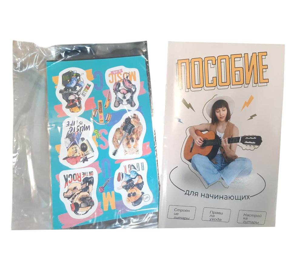 - В комплекте цветная коробка, инструкция по настройке и игре на гитаре, цветные наклейки